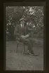"Gustav Jansson, Stenstorp" Porträtt av en leende ung man som sitter på en stol utomhus.