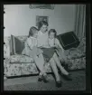 1677 B Konstfackskolan (tösen Boheman). En ung kvinna sitter uppkrupen i en soffa och läser.