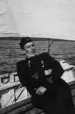 Bilden visar tre befäl som står i en livbåt och bestämmer positionen med hjälp av sextanter.