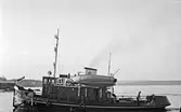 Bilden visar en tjockt svart rökmoln från ett örlogsfartyget. I förgrunden syns ett livbåt som hänger på en dävert.