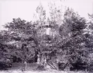 Här är ladugården nymålad och har fått nytt papptak. Fähusdelen i bulteknik i mitten rymde fähus med hoimd till höger. Två laddelar verkar mycket, så den ena har nog tjänat som vagnbod och förråd. Luckan till foderloftet står lutad mot kaninburen. På grindarna kan man se att här bodde en snickare!