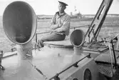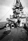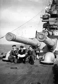 Fyra besättningsmän sitter på/i förliga 28 cm kanonerna på HMS Sverige