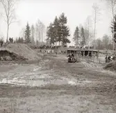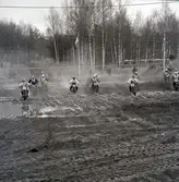 Falköpings motorbana. Till vänster Helge Garenfeldt i vit overall, till höger Sven Åke Johansson och i kanten Gösta Persson. Okänt år.