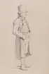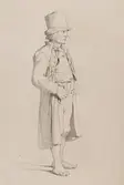 "Luggudde Härad (...svårläst -ortsnamn?).Bonddräng från Billeberga i vit rock, skinnbyxor och skinnrväst" Man i helfigur i dräkt med hatt samt bara fötter. Blyertsteckning i storformat av Otto Wallgren.
