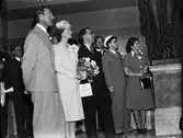 "Vårfesten i Upsala nordiskt betonad" - prins Gustaf Adolf, prinsessan Sibylla och Gösta Knutsson på 'Trappmarschen' i Universitetshuset, Uppsala 1942