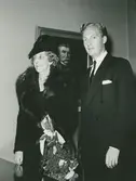 "Prinsessan Ingeborg hälsar på sin kände landsman M:r Erik vid ett besök på NK på tisdagen och, vid en särskild visning, besåg hela hans kollektion hattar."