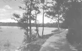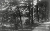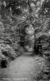 Foto av män och kvinnor som tar en promenad längs en skogsväg. Text i album: "Skogsväg till Nordingrå kyrka 1904".