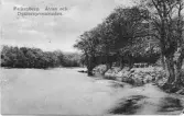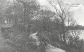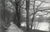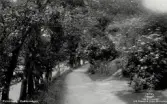 Två "motionerande" kvinnor på promenad invid Kneippbadens kuranstalt i Norrköping. Sannolikt var de gäster vid kurbadet som vid sidan av de där rekommenderad kallvattenbehandlingar förespråkade motionspromenader, vartill promenadstråket utmed Motala ström passade synnerligen väl.