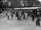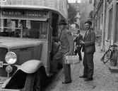 Busschafförer och resenärer utanför Uppsala busstation, Järnvägsområdet, Uppsala mars 1939