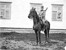 Man på häst vid bostadshus, Broby, Uppland
