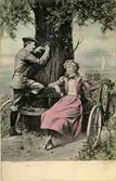 "Frieri och kurtis". Ungt par vid bänk under ett träd. En cykel står bredvid. Vykort.