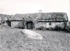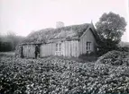 Låg stuga, troligtvis i Segerstad, med brädpanel, torvtäckt tak. Stugan har kraftig sättning.
