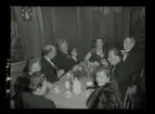 568 F. Stieg Trenter, Torremolinos. Ett sällskap umgås i en soffgruppav rotting, framför en öppen spis.