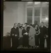 Folkmusiker spelar för människor som sitter på uteservering. Skansen, Stockholm.