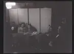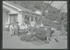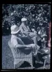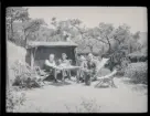 Ett sällskap sitter ute och fikar i en trädgård.
