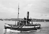 Fregatten HMS Vanadis sista resa. Utanför Kastellholmen och med Beckholmen till vänster och Fåfängan synlig i bakgrunden. Två bogserbåtar hjälper till.
