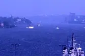 Krigsfartyg på Strömmen med Katarinaberget i bakgrunden.