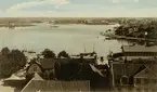 Saluhallen vid Hamnplan. Bostadshus och byggnader i bakgrunden. Båtar i hamnen. Stadsvy. Panoramabild.