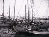 Enligt text som medföljde fotografiet: "Bohuslän, Skärgården, Marstrand, Sillbåtar. I hamnen under vinterfisket efter sill".