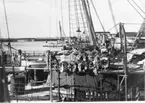 Ekensbergs varv 1970, fotograferat från Stora Essingen. I förgrunden villor på Stora Essingen. Av fartygen kan sjömätningsfartyget JOHAN MÅNSSON (delvis skymt) längst till vänster samt därefter lastfartyget VAIGU (urspr. NORDANVIK) identifieras.