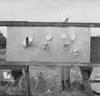 Nybyggnation av tre förråd 1986. Några blandade bilder från de samtida byggprojekten i Utö läger; livsmedelsförrådet, kokhuset och Värnskolans förråd. Bild 1: Staffan Löding och Kurt Madell diagonalmäter plattan så att stomresningen kan få starta. Bild 2: Stålstommen till plåtförrådet rest. Bild 3: Profiler till en av de andra byggnaderna monteras. Bild 4: Kurt Madell och Kjell Strömkvist studerar ritningar. Bild 5: Sulan till livsmedelsförrådet rak och fin!