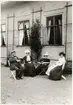 "Det glada 90-talet". Apotekare K.H. Rydberg på Vallen, Telestad, ca 1900. Ett sällskap på besök har slagit sig ner i skuggan vid boningshuset.