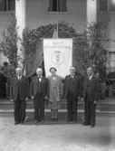 KF:s [Kooperativa förbundets] 40-årsjubileum i Folkets Park i Kalmar 1947. Harald Ekelund, Walter Thunell (KF Konsum, Stockholm), Nils Karlsson. ? ? Berglund, Karl Gustaf Gustavsson, Sandstedt. Karlsson (flickan med fanan), Agda Johansson.