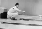 Nils Lindahl, Malmö, är på väg fram med klotet. Malmö-kamraten Malte Persson, som sitter bakom, väntar på sin tur. Ingemar Bengtsson. från Göteborg, t v är beredd med sitt klot. Vid räcket bakom väntar Börje Kvist och Kjell Pettersson, båda från Malmö.