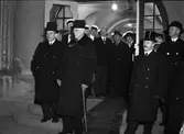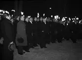 "Stil, stämning och gemyt präglade invigningen av Upsalastudenternas tennishall" - kung Gustav V tar emot Uppsala Studentkårs uppvaktning, Gymnastikhusets trappa, Uppsala 1937