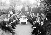 Arbetslag framför lokomobil som drev uppfodringsverk för torv på mossarna omkring Fåglaviks glasbruk. Torven användes som bränsle på bruket.