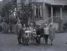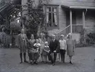 "1931. 80. Trädgårdsmästare Winblad, den gamla, den unge står till vänster, är duktig ung man." "Trädgårdsmästare Oscar Winblad. Fr.v. Valter (sedemera trädgårdsmästare i Kvistrum), fru Winblad med Rune i knät, Ann-Marie, Inga, Oscar, Karl-Erik och Anna-Greta. Inga sedemera gift Ekerum."