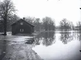 Översvämning vid Villagatan 1944. Vattenverket och tvättstugan i fonden. T.v. hus på gamla Ingarögatan.
