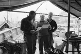 Underhåll av flygplan i skyddsvärn vid Svenska frivilligkåren i Finland, F 19. Tre mekaniker i arbete vid skyddshus för flygplan.