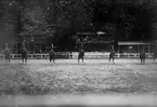 Under kamratdagen var det uppvisningar och tävlingar. Här sabelfäktning till häst på prishoppningsbanan. Åskådarna på sluttningen av Dunkehallsåsen.