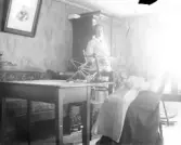 Vävning på Runö, Misterhults skärgård. Vävstol med harneskutrustning. Greta Andersson, f. 1896, lärde sig väva på Gamleby folkhögskola. Vävar-Oskar Larsson lärde henne väva damast hösten 1920 hemma på Runö. Under 50 år vävde Greta Andersson åt hemslöjden i Västervik. Gretas syster Karin Holmberg, Runö, väver fortfarande damast men med dragutrustning. Greta Anderssons vävstol finns hos Ingrid Nilsson, Tuna. I Oskarshamns-Tidningen 1947 finns en initierad artikl om Greta Andersson och hennes vävkonst. Hon var även verksam som lärare för damastvävare i bl a Hallingeberg.