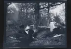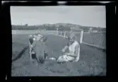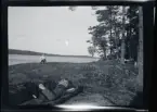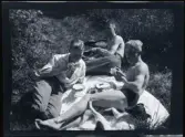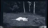 Leonarth ligger och vilar på en trädgårdsbänk utanför familjen Morthensens villa Solveden, Djursholm.