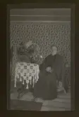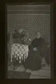 "Mina Karlsson, Hedäng" En kvinna sitter i ett rum med blomminga tapeter, vid ett litet bord med virkad duk. På bordet står gratulations-blommor.