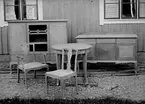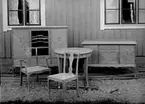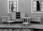 Kalmar, Kvarnholmen, Kv Åldermannen 4, Norra Långgatan. Före rivningen 1956. "Sjöbringska huset". Övre våningen rådmannens rum. Möbler från biskop Sjöbrings tid. Soffan gjord av en mycket uppskattad snikare Pettersson, som hade verkstad på slotet.Fotografiförstoring över biskopinnan Sjöbring med sondöttrar. Rådman Sjöbrings döttrar.