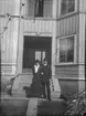 "J. L. med sin fästmö.1/50 s. f. 11. 14.00 24/4 1916. Sol förstärkt. Av R. L. Agfa." Porträtt av en man och en kvinna utomhus, stående framför ett bostadshus.