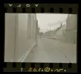 Stockholm, Sveavägen/Tegnérgatan sett snett från ovan. Spårvagn, hästskjuts och några fotgängare. I bottenvåningen på husen butiker. Skyltarna lyder: "Robert Hellbom, Manifaktur", "Duktyger, Linne och Bommulsläsrfter", samt på andra sidan gatan: "Manifaktur".