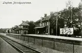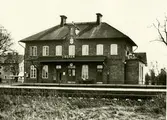 Trafikplats anlagd 1897. En- och en halv vånings stationshus i trä. Observera bromsarna som sitter uppe på de lastade vagnarna. DONJ lok 6 "Linghed" och ångdressinen "Huppen".