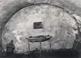 "Tjuvakistan", Lenhovda, i sitt nuvarande skick. I ena gaveln fanns ett gallerförsett litet fönster. På bordet ligger hand- och fotfängsel. Till vänster syns ett fängsel fastsatt i väggen.