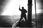 Oretuscherad. Isvandringen. Ett islandskap med okänd person (S A Andrée?) med öppet vatten framför sig. Någon (Knut Fraenkel?) ror båten.