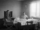 "En interiör från stugan nr 133, där hr Severin Jansson och hans maka just njuta av en kaffepaus i trädgårdsarbetet", Tunabergskolonin i Tuna backar