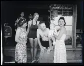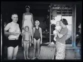 Bassängen vid Gösta Klingbergs villa i Hjärsta. Fr.v hoppar Eva Cedelind, Gunnel Klingberg, Annika Nilsson, Harriet Alexandersson, Anneli Cederlind och Margareta Bratt. Gösta Klingbergs son Bengt t.h.