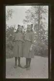 "Laggartorps skola" Porträtt av två flickor i likadana kläder.
