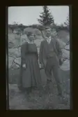 "Frida och Ivar, Väsby" Fotografens fru och yngre bror fotograferade utomhus framför en stenmur.