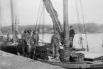 Lasten tas ombord i "följaren", Oden - Gravarne, för snabb transport till fabriken. Fr.v.: Valter Askman, Per Karlsson, Albert Amandusson, mannen till höger tillhör Odens besättning.