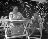 Handskriven text på fotots baksida: "Mamma med sonen Gustaf på gården i Waxholm." Text i albumet, under bilden: "Mamma med sin Gustaf i Waxholm."