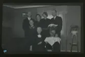 Man med bok och kvinna med spinnrock. Okänd plats i Kronobergs län, tidigt 1900-tal.